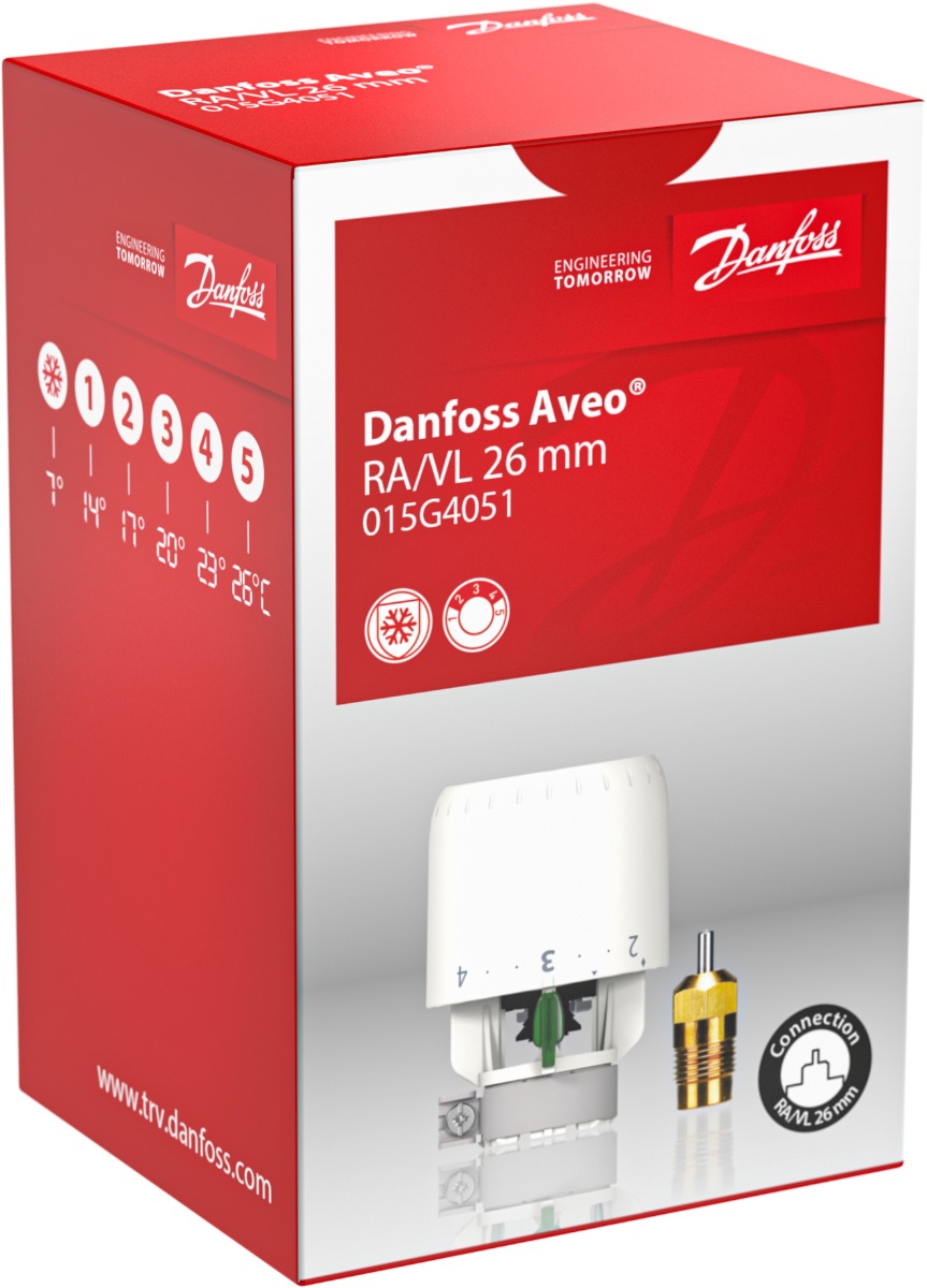 Danfoss Aveo er et omfattende program af termostatiske følere i høj kvalitet, der er produceret i Danmark. Danfoss Aveo termostater anvender en unik gasfyldt teknologi, der giver verdens hurtigst reagerende selvvirkende termostat. Danfoss Aveo termostaten installeres på en radiatorventil. Kombinationen af termostat og ventil regulerer den individuelle rumtemperatur til et ønsket niveau, ved at justere flowet af varmt vand gennem radiatoren. Danfoss Aveo termostaten kan anvendes til alle typer varmesystemer, og takket være den kompakte størrelse passer den til de fleste applikationer