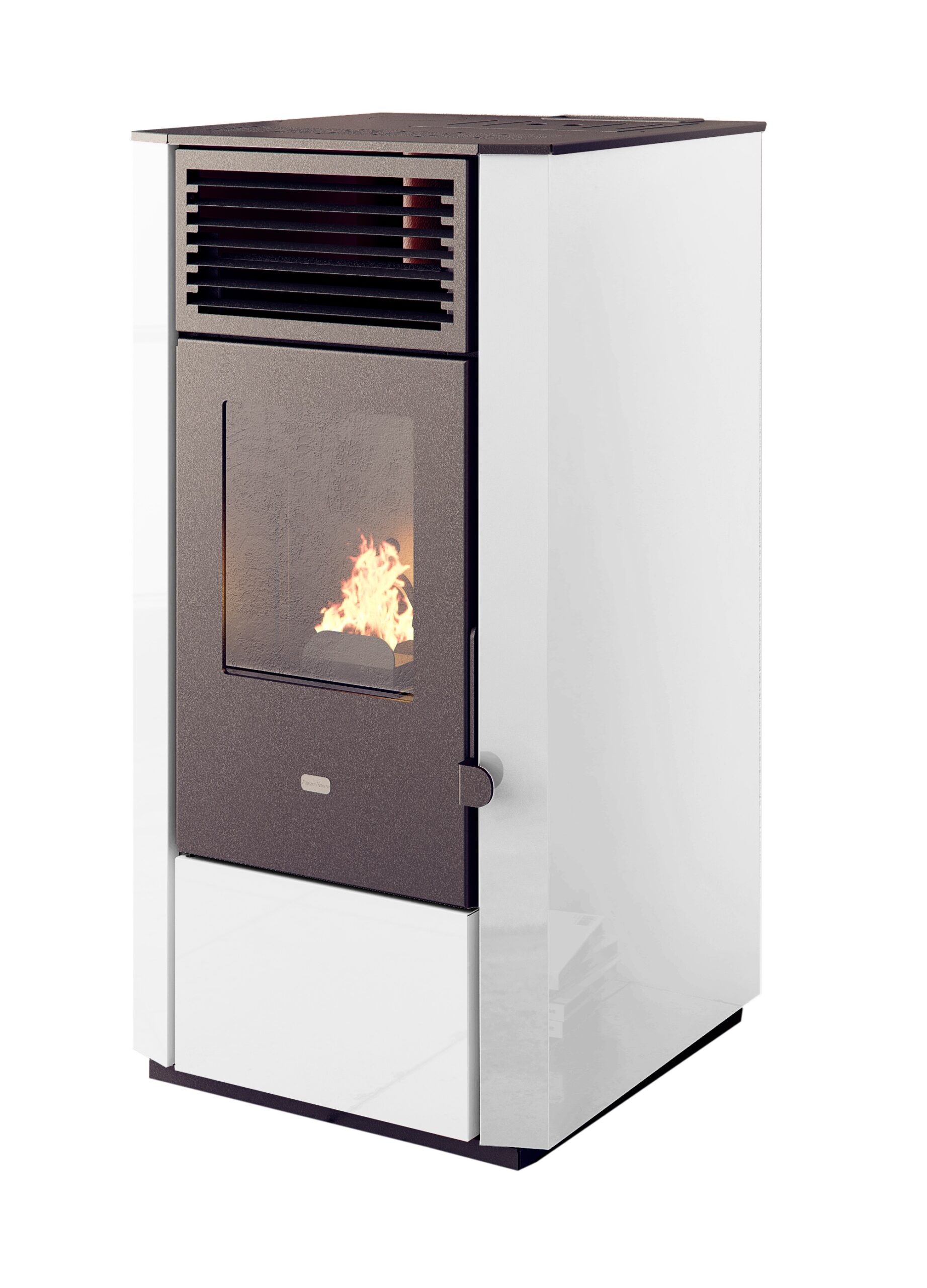 Kompakt kvalitets pilleovn i smart hvid farve med høj ydelse og mulighed for aftræk både vandret og lodret (topafgang).