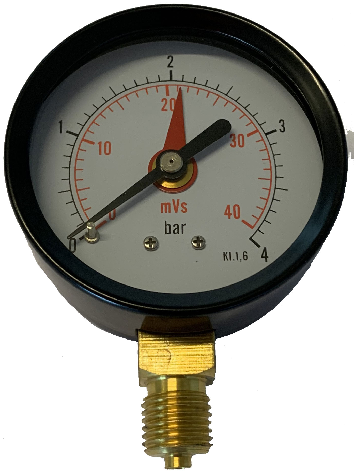Manometer skive ”bar-skala”: Sorte tal på hvid baggrund. ”mVS-skala”: Røde tal på hvid baggrund.