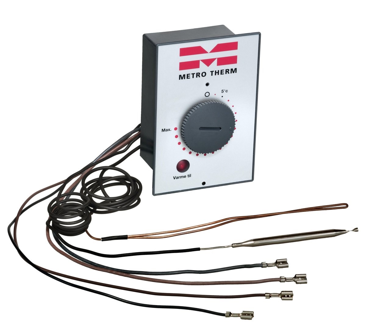 Metro styreboks til Metro varmtvandsbeholdere fra 1997 og frem. med 2 polet over-kogsikring 110 c, glimlampe og kabelføring.