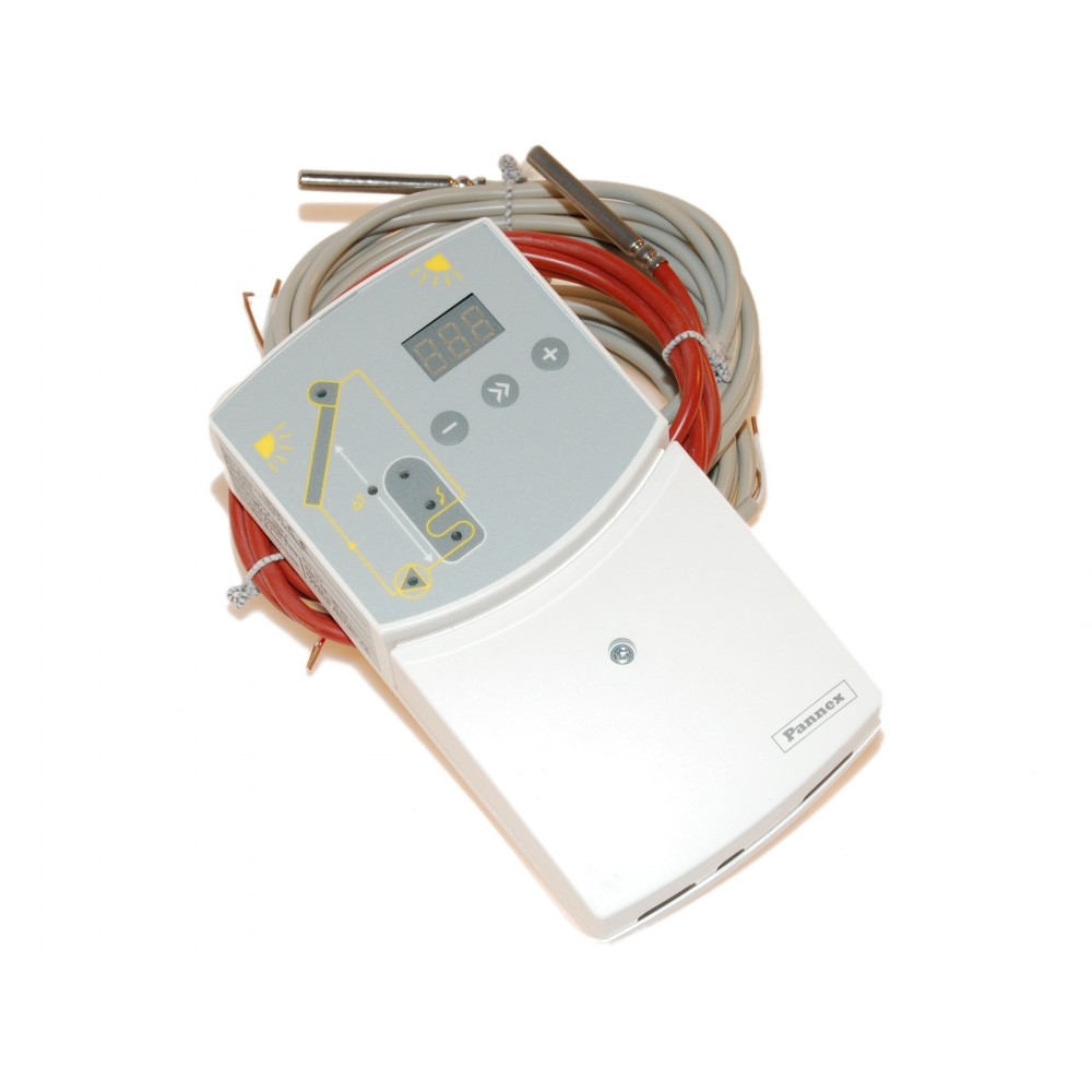 DTC2102 Solfangerstyring er en moderne digital Pannex solvarmestyring med 3 stk. føler til regulering af solfanger/ varmtvands beholder og bortledning af overskudsvarme, samt mulighed for digital aflæsning af temperatur på hver føler.