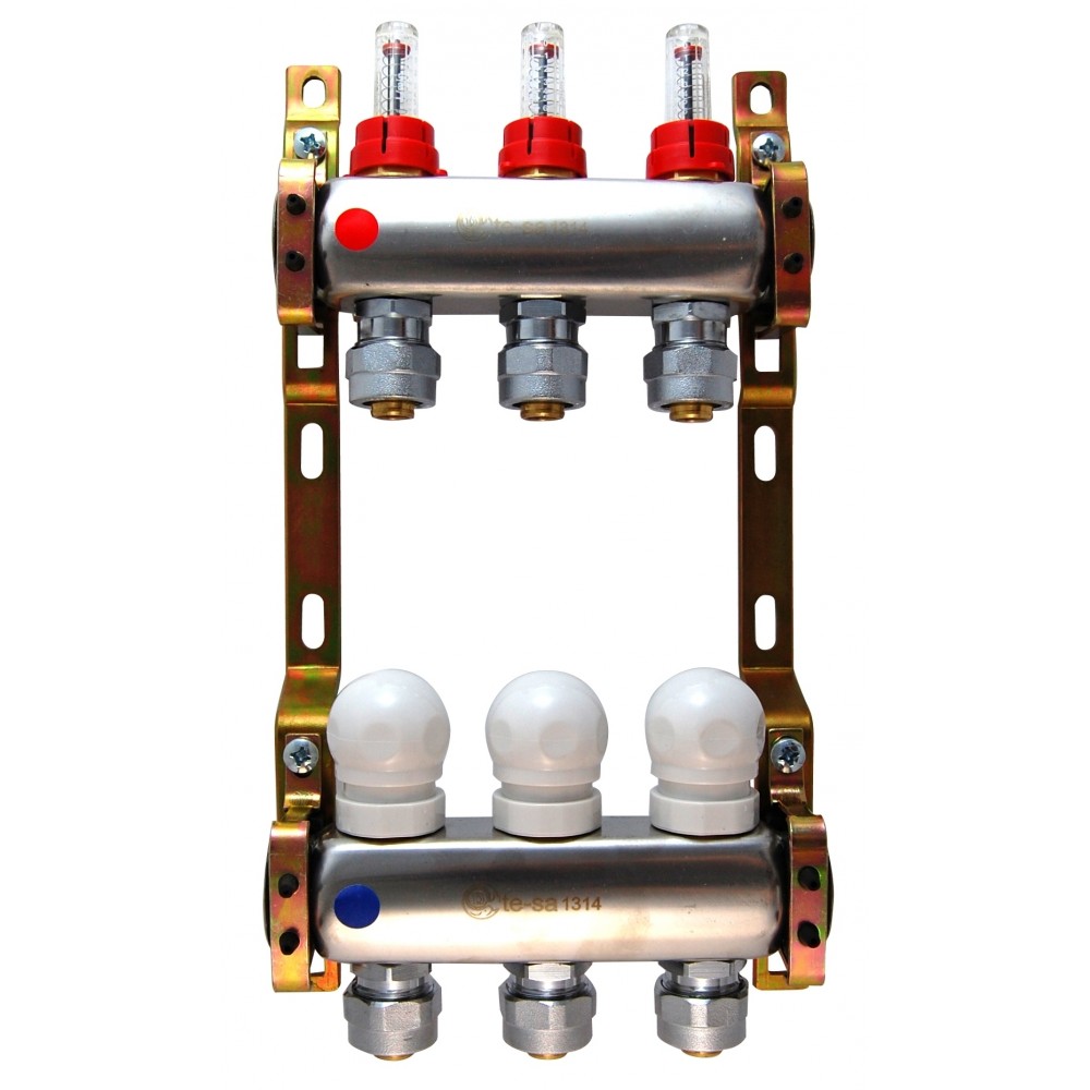 Te-sa manifold til 20mm gulvvarmeslange og med flow måler til manuel styring på fremløb.