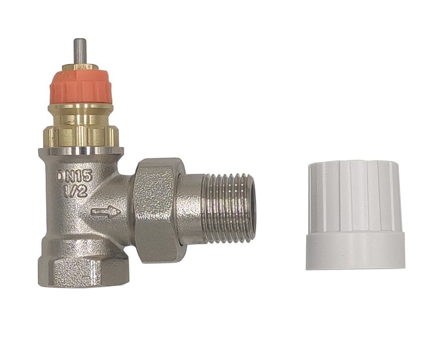 Vinkelløbende radiatorventil med forindstilling for optimal fordeling af vandet i varmeanlægget.
