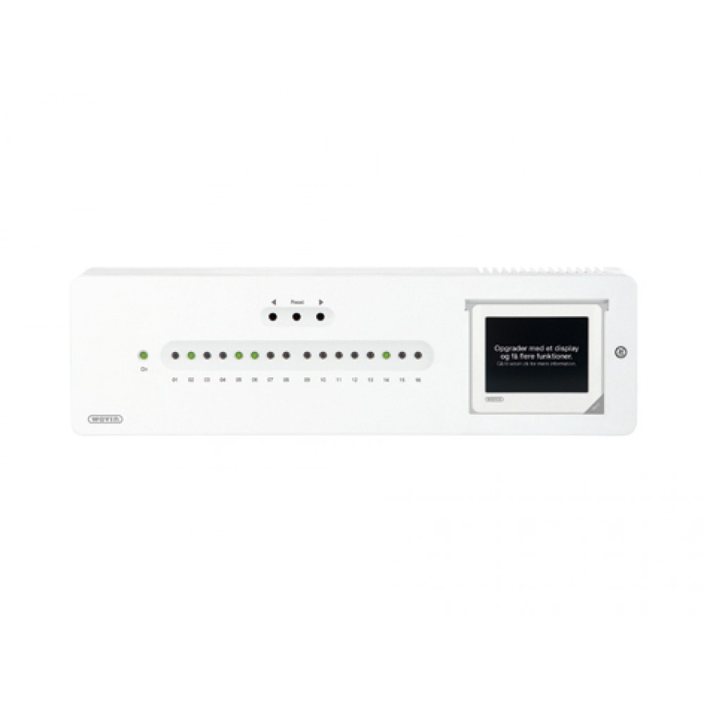AHC 9000 styreenheden kan styre op til 16 kredse, så du selv i større boliger kan nøjes med at installere én enkelt styring. Hver enhed kan tilsluttes i alt 48 komponenter (magnetkontakter og rumtermostater), og der er mulighed for at koble op til tre enheder sammen i større byggerier.